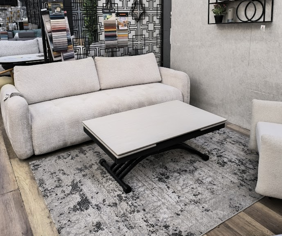 שולחן סלון מעוצב עם מנגנון חכם, המתרומם ונפתח לשולחן פינת אוכל מרווח –